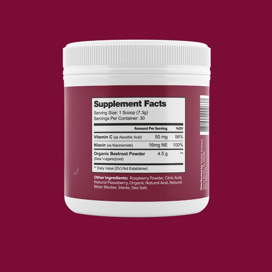 Our Visible Science Beet Root Powder enhances your daily routine with just one scoop of ruby-red goodness! We've thoughtfully combined organic beetroot powder with a splash of raspberry, acai, and just enough stevia to create a flavor you'll enjoy.