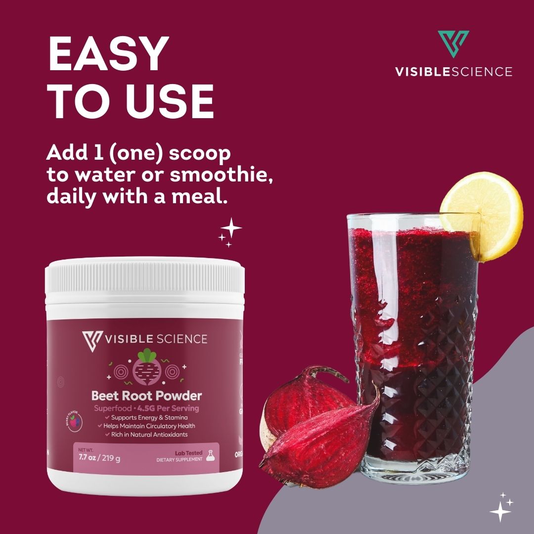 Meet Visible Science Beet Root Powder! We've transformed nature's ruby-red, nutrient-rich vegetable into a deliciously tangy raspberry-acai blend. Packed with organic beetroot and essential vitamins, this vibrant scoop mixes instantly into your favorite drink. No earthy aftertaste here—just a perfectly balanced, naturally sweetened addition to your morning routine!