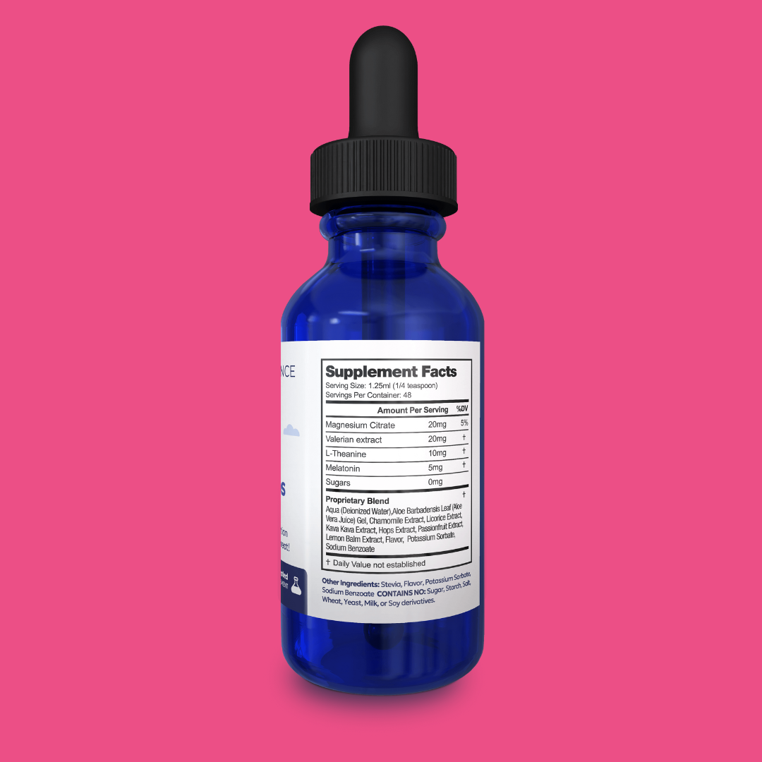 Our berry-flavored Sleep Drops are formulated to support relaxation with just a few delicious drops. We've carefully formulated this blend combining traditional botanical ingredients like chamomile, valerian, and passion fruit with L-theanine and magnesium citrate into one convenient, sugar-free liquid formula.