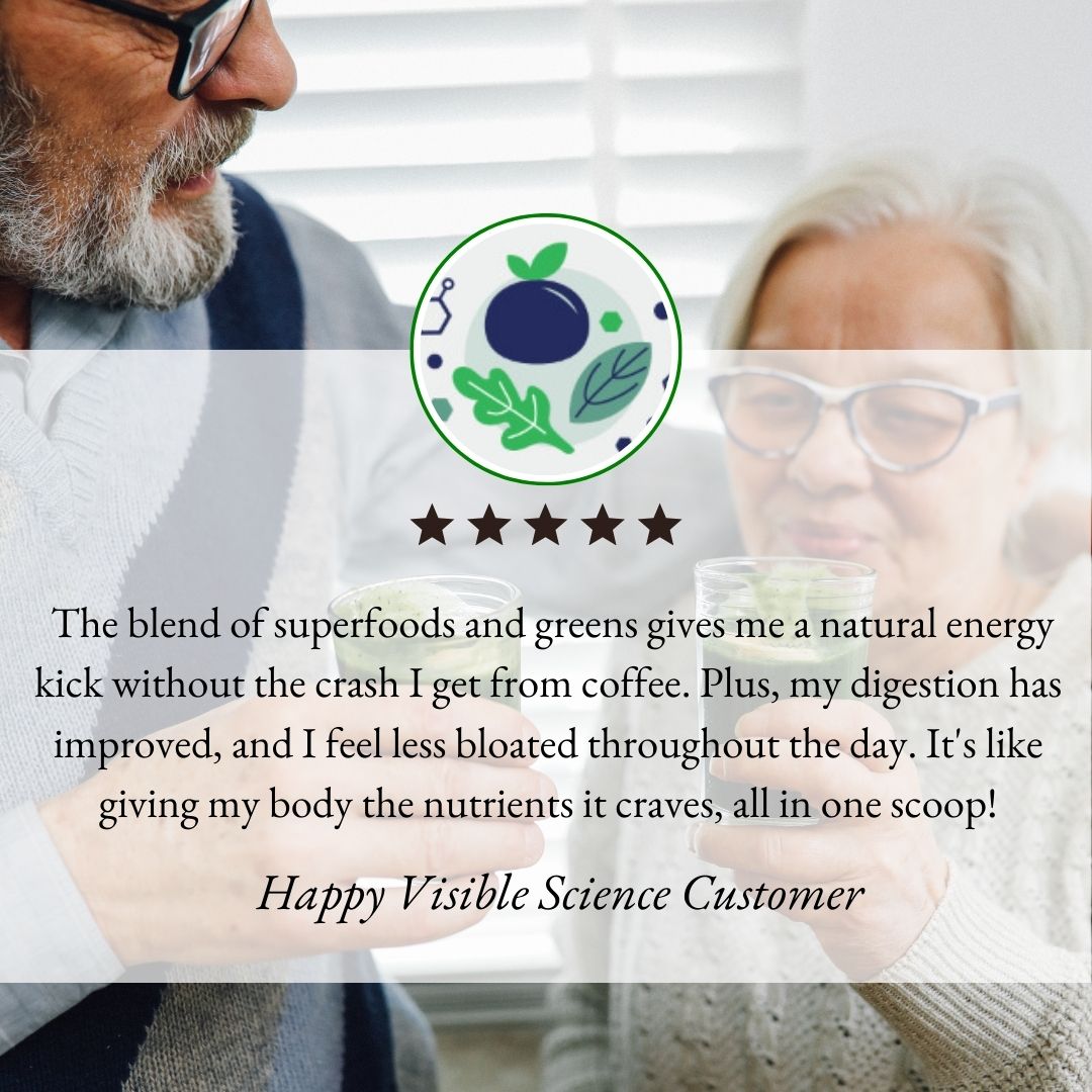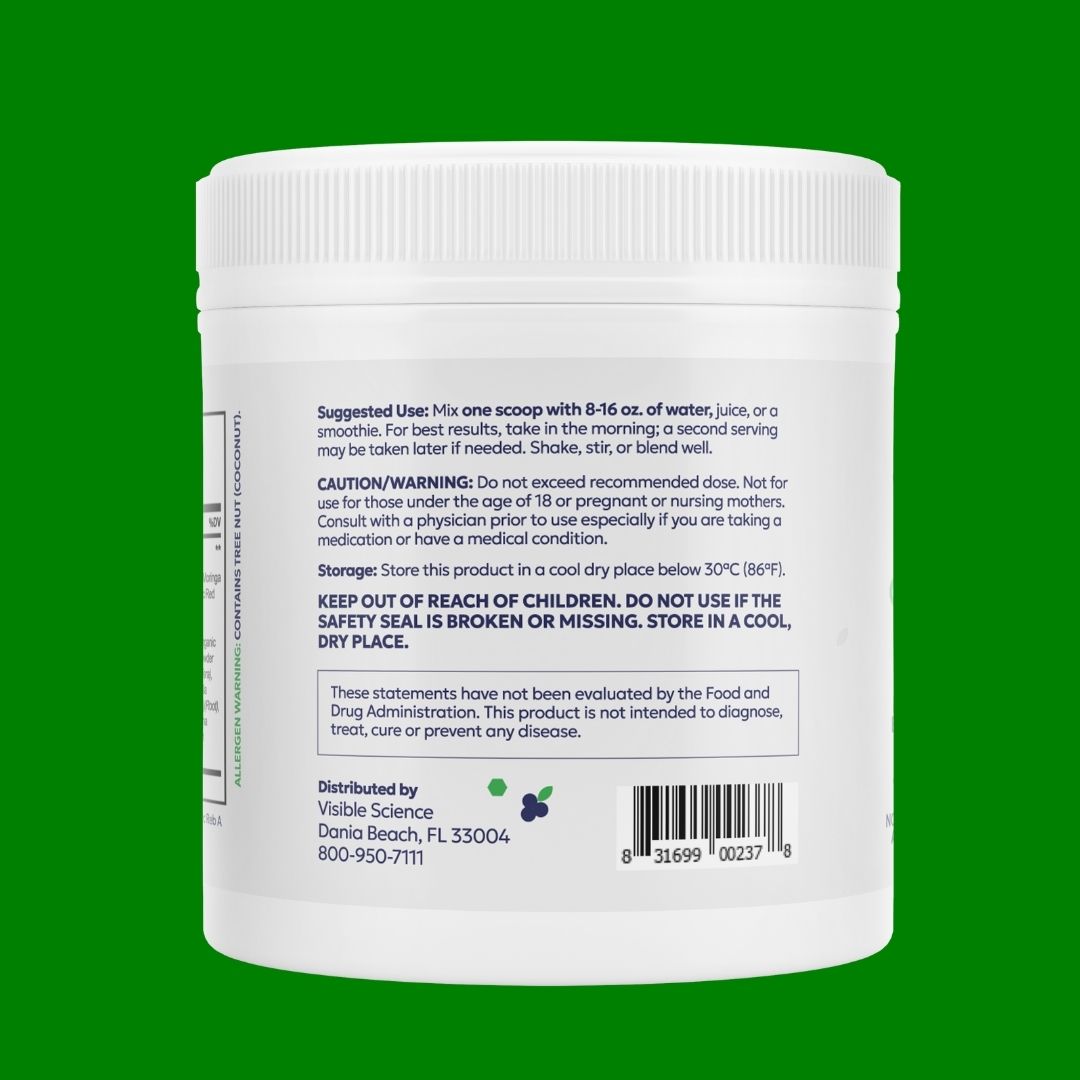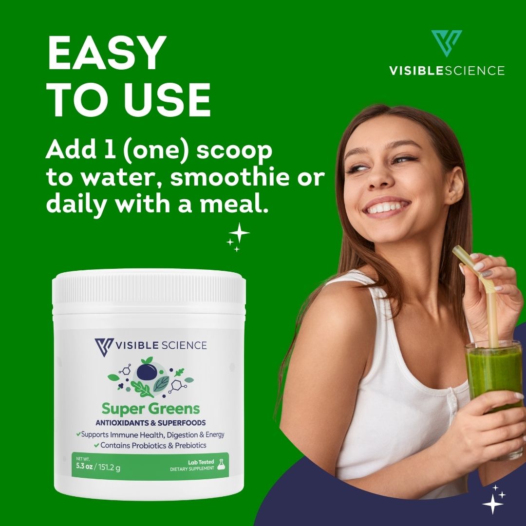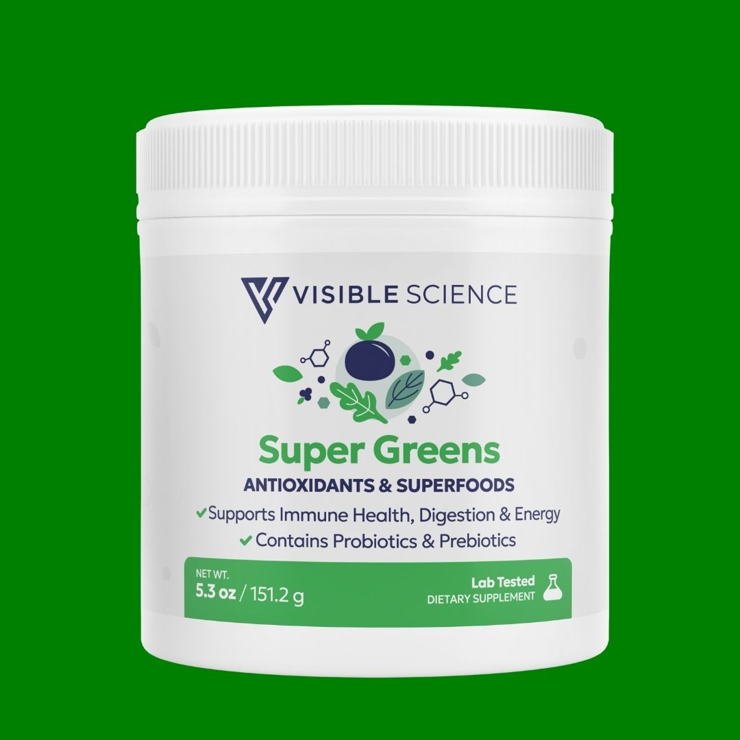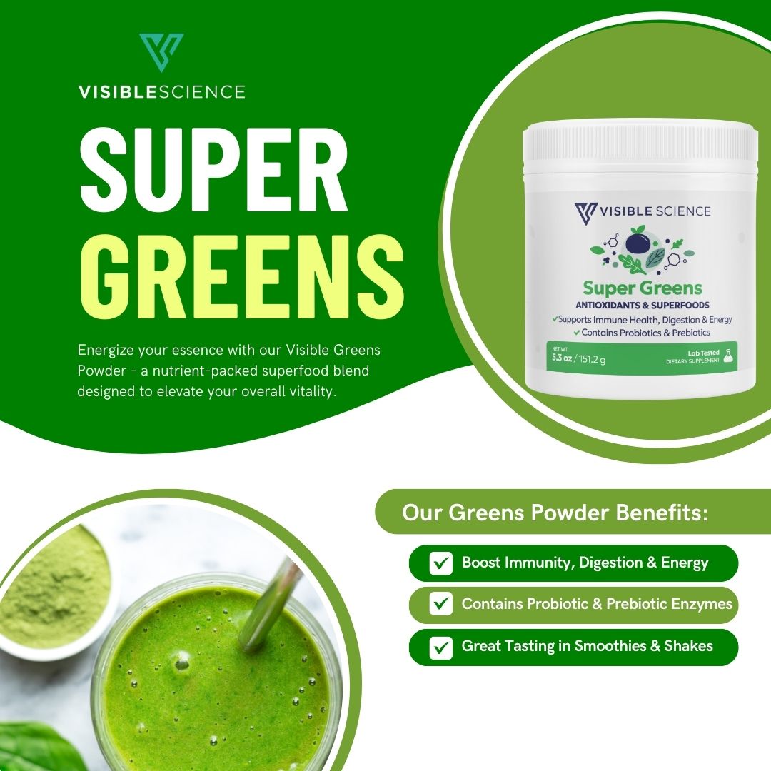 Meet Visible Science Super Greens Powder! We've packed nature's nutritional all-stars—wheatgrass, spirulina, kale, and more—into one deliciously zesty citrus punch. This vibrant blend features 17 organic ingredients plus probiotics, designed to deliver a garden's worth of goodness without the lawn mower. Just shake, sip, and help support your daily nutrition with some plant-powered pizzazz!